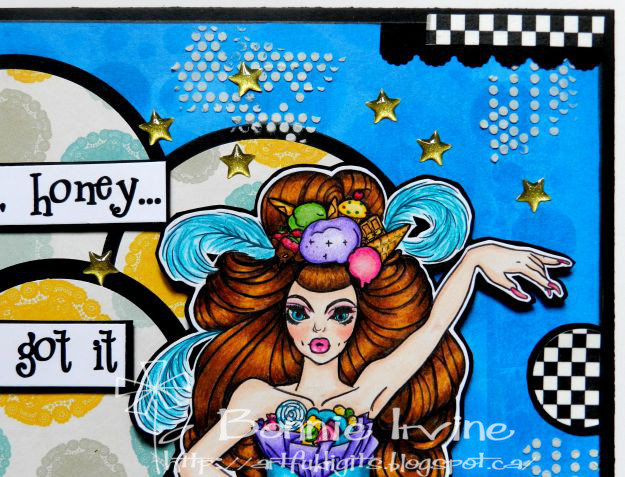 I coloured Betty Cockus Candy Candy with a combination of Prismacolor and Polychromos pencils. I fussy cut her leaving a narrow white border and then matted her with black cardstock. Foam dots were placed on the back of the image for added dimension and to let Betty really stand out from the background (pun intended).