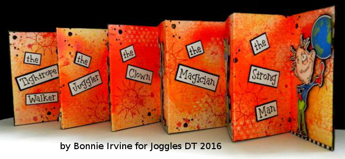 Hi everyone. It's my turn to post a DT project over on the Joggles blog today and I am so excited to share this project. I combined one of the wonderful Joggles Accordion Books with 5 of the Joggles/Bloobel Cling Mounted Rubber Stamps drawn by Lisa Graham to create my very own circus troupe. I love the expression "Not my circus, not my monkeys" and decided to do a spin off on that. The 5 images became my very own circus performers...love them!