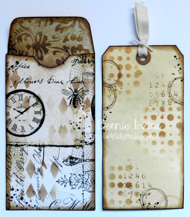 I covered the front and the inside of the flap with designer paper, I think from Prima's The Printery paper stack. The top of the envelope was punched to create easier access to the inside tag. The inside flap was cut long enough from contrasting paper to cover this semi circular opening once the tag was removed. I didn't want the kraft colour of the envelope to distract. All of the edges were inked with Coffee Archival and the same ink was used to stencil designs on the envelope front.